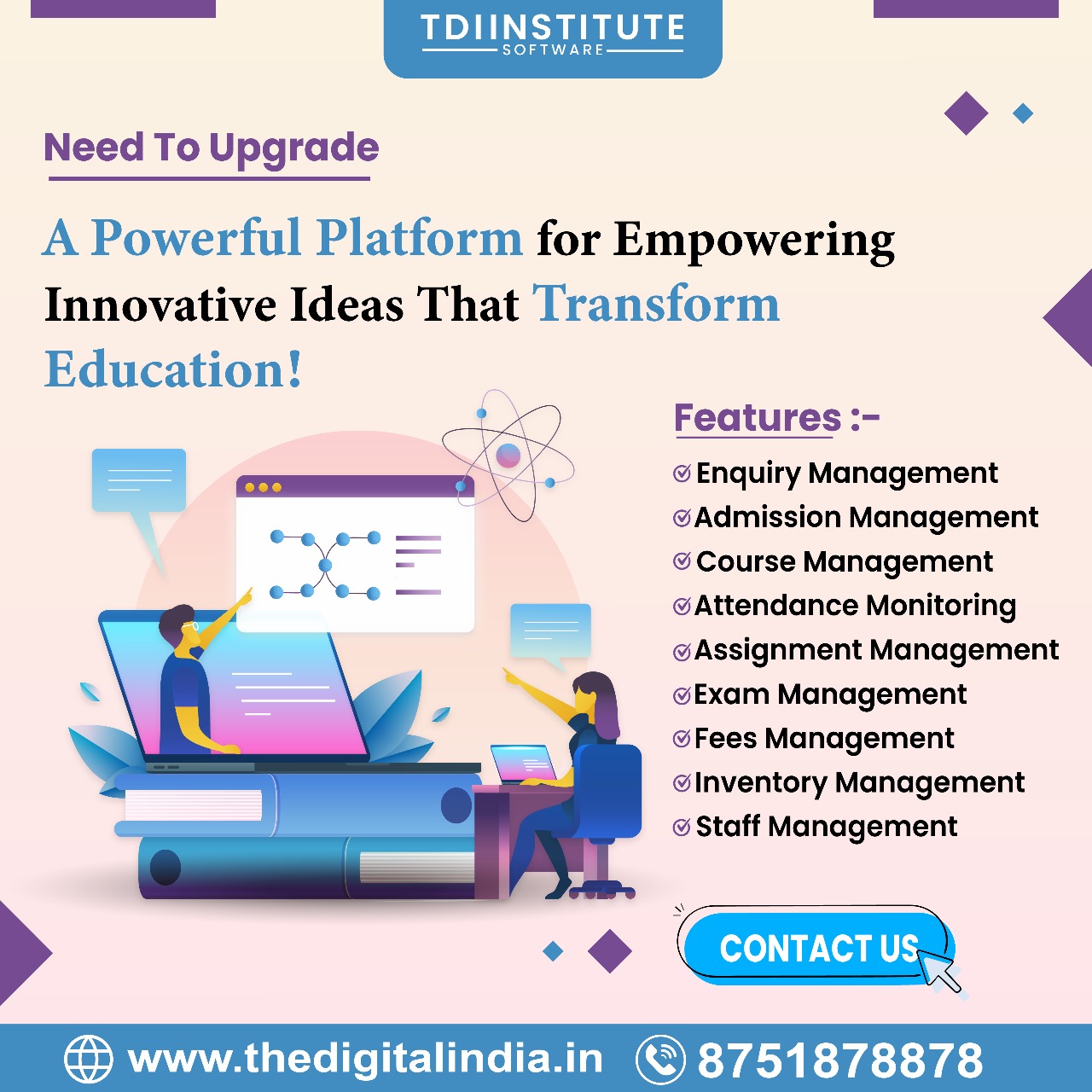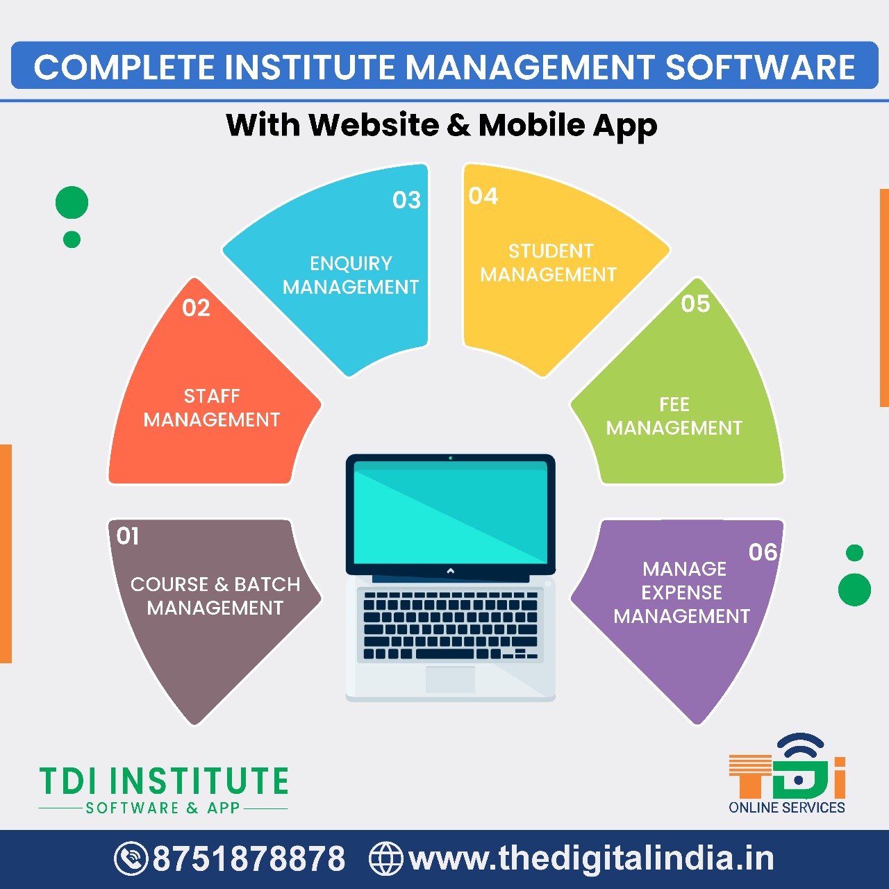 We, TDI Online Services are a professionally managed IT Services Provider, engaged in service providing like Educational ERP Software, CRM Software & Apps for Business Management, HRM Software & Apps for Staff e-attendance & payroll reports, Visitor Management Apps & Call Management Solutions. Also, we provide Customized Software, e-Commerce Website & Mobile App Development Services.